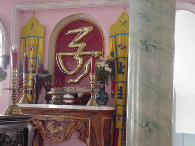 °¢ »ç¿øÀº 3¸éÀº º®À¸·Î µÑ·¯½×¿©ÀÖ°í ÇѸéÀº ÃâÀÔ±¸·Î µÇ¾îÀÖ´Â ÁýÀÌ´Ù. µé¾î°¡´Â ÀÔ±¸¿¡´Â ¾î´À »ç¿øÀ̰ųª¸¦ ¸··ÐÇϰí 3¸íÀÇ ¼ºÀÚÀÇ º®È¸¦ º¼ ¼ö ÀÖ´Ù. ÇÑ »ç¶÷Àº Trang Trinh(1492-1587)Àε¥ º£Æ®³²ÀÇ ¹ÎÁ·ÁÖÀÇ¿Í µ¶¸³À» ¿¹¾ðÇÑ ½ÃÀÎÀ̸ç, ´Ù¸¥ ÇÑ »ç¶÷Àº Á¦±¹ÁÖÀÇ¿¡ Ç×°ÅÇÑ ÇÁ¶û½º ½ÃÀÎ Victor Hugo(1802-1885)ÀÌ¸ç ¸¶Áö¸· ³²Àº ÇѸíÀº Sun-yat-sen(1802-1925)À¸·Î 1911³â Áß±¹ÀÇ Çõ¸íÀ» À̲ö ÁöµµÀÚÀÌ´Ù. ÀÌ º®È´Â ½Åµµµé¿¡°Ô ±×µéÀÇ ¸Þ½ÃÁö¸¦ ½Åµµµé¿¡°Ô Àü´ÞÇϴ Ưº°ÇÏ°í °·ÂÇÑ Àǹ̸¦ ºÎ¿©ÇÑ´Ù. »ç¿ø ³»ºÎ·Î µé¾î°¡¸é ¶Ç ´Ù¸¥ Á¦»ç¸¦ µå¸®´Â 8¸íÀÇ ½Å»óÀÌ ¼¼¿öÁ® Àִµ¥ ´ÙÀ½°ú °°´Ù(Tim ve ban sac van hoa Viet Nam. Tran Ngoc Them. P.564)